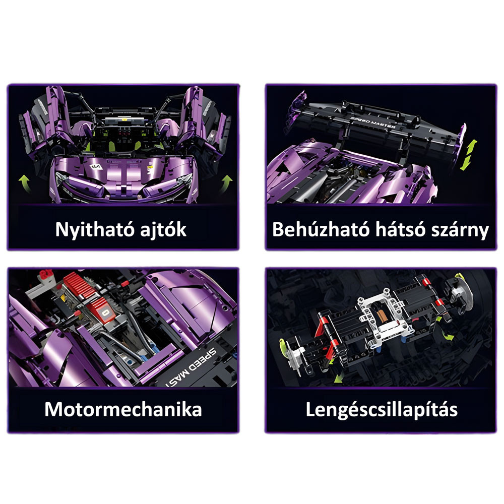 Építsd meg saját kezűleg a világ egyik legikonikusabb hiperautóját! A GULY 10617 készlet 3568 precíz alkatrészt tartalmaz, lila színben, nyitható ajtókkal, első és hátsó motorháztetővel, működő váltóval, kormányművel és felfüggesztéssel. Statikus, motor nélküli kivitelben, részletgazdag kidolgozással.